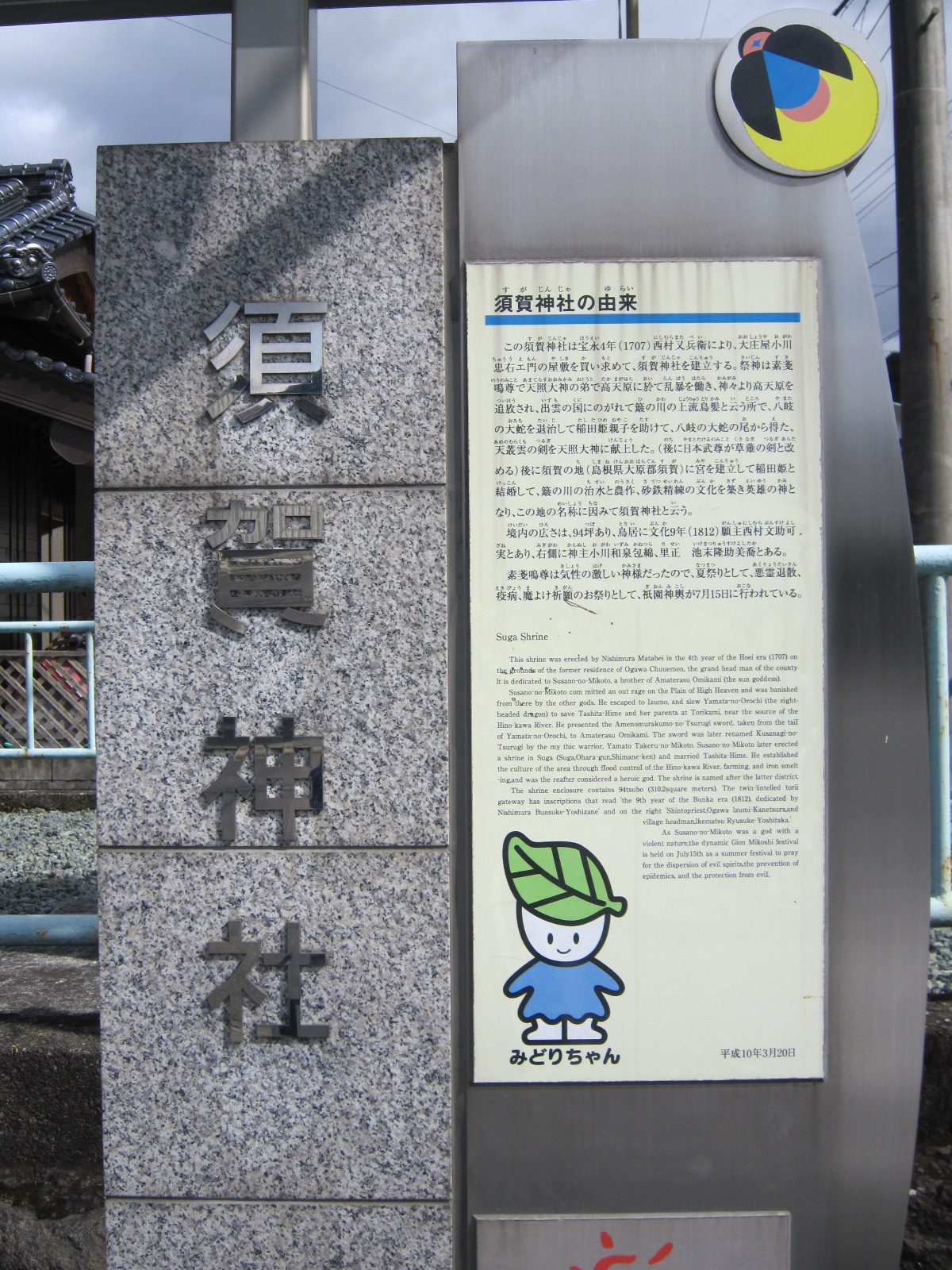 写真をクリックして拡大すると説明文が読めますが、端的に言えばここの神社の祭神は天照大神の弟、素戔鳴尊(すさのうのみこと)が高天原を追い出されてしまい、逃れてきた出雲の国の簸(ひ)の川の上流の鳥髪という場所で稲田(たした)姫親子を八岐の大蛇から助け、その八岐の大蛇の尻尾から得た天叢(あめのむら)の剣を素戔鳴尊が天照大神に献上しました。で、そのあと稲田姫と結婚して現在の島根県の大原郡に建立したのが須賀神社というわけです。
