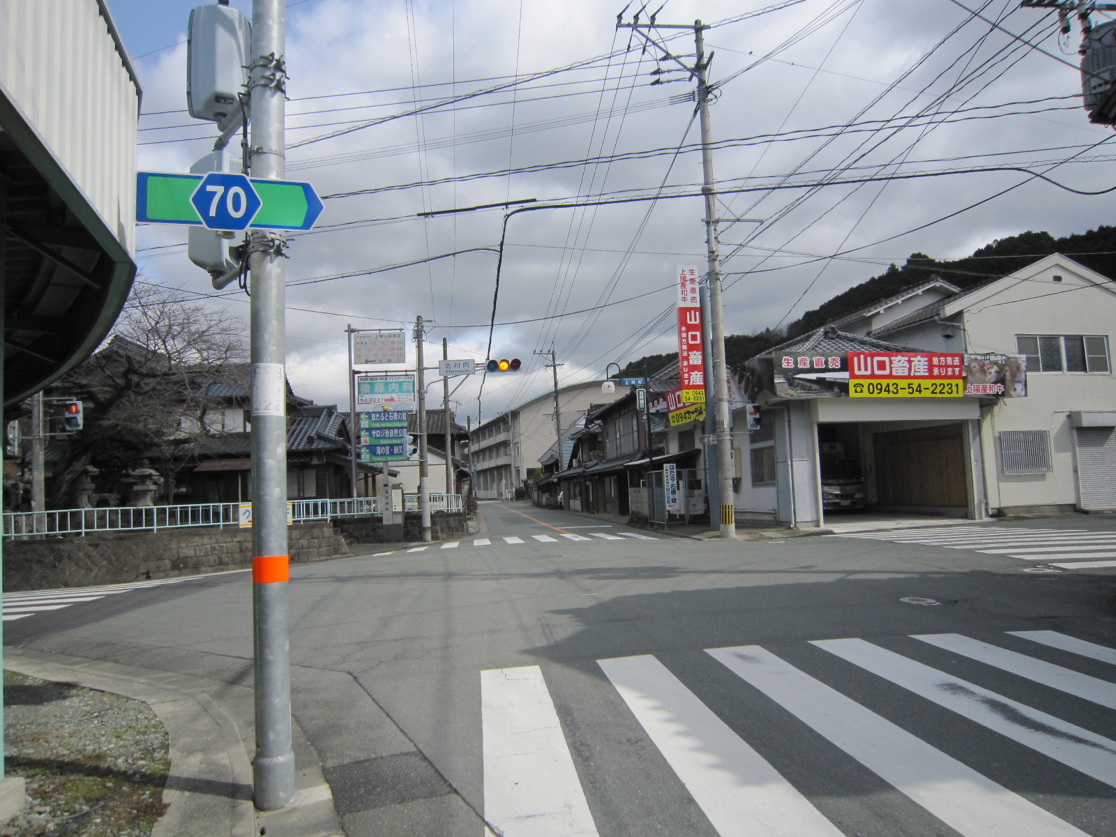 ・Y字路の股の部分に標柱が立っており、周囲は鬱蒼とした麓の住宅地。