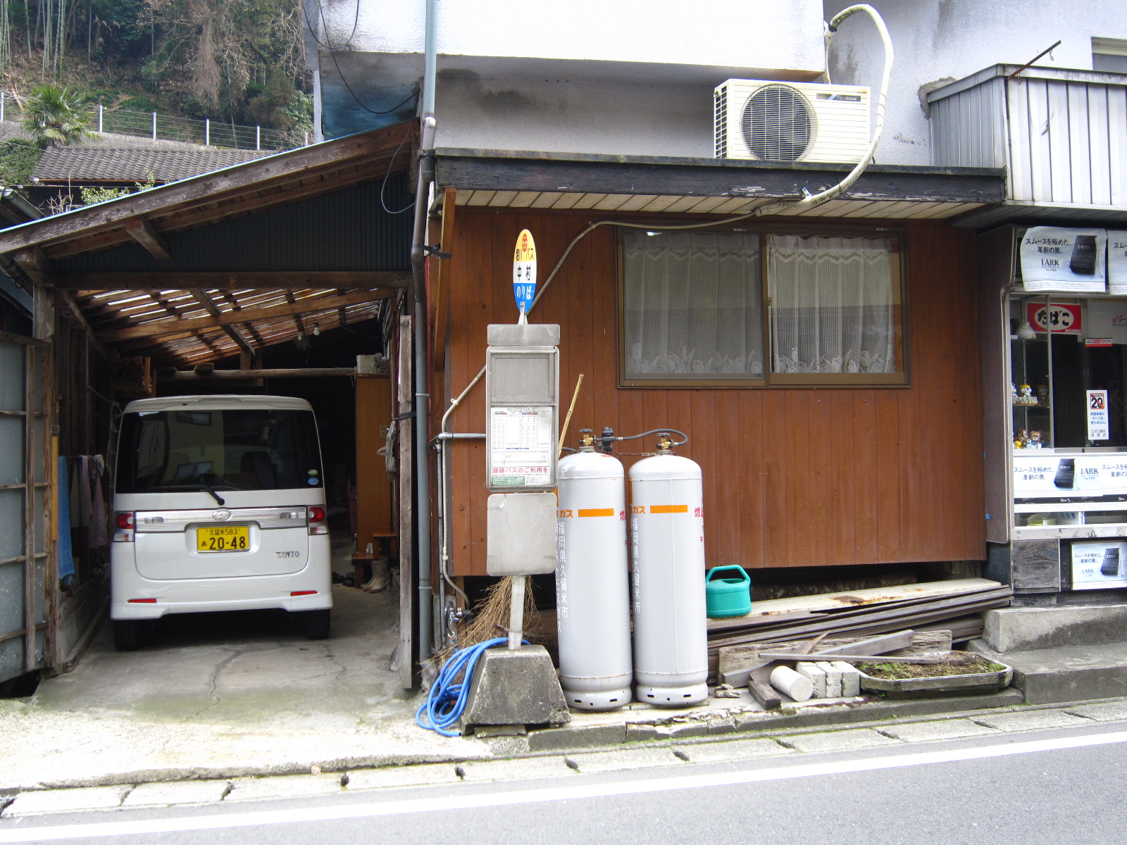 ・ちょうど商店街が始まるところにバス停があり、民家の軒先に標柱が立っている。
