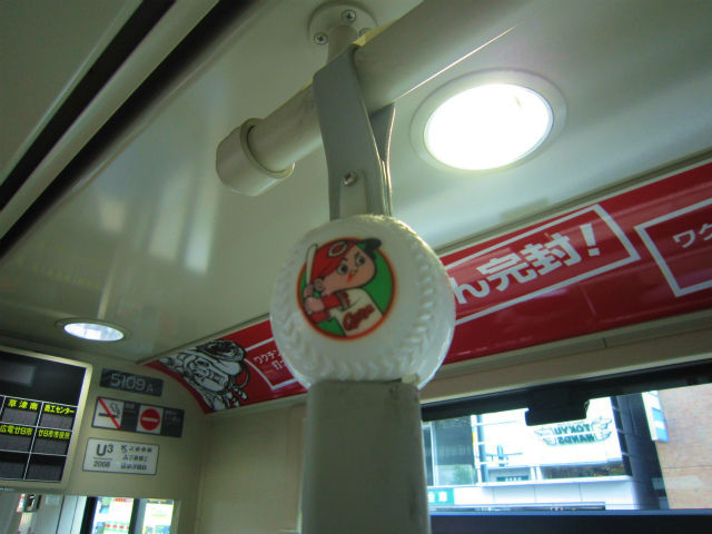 つり革にも、車内広告にも広島カープのカープ坊や。