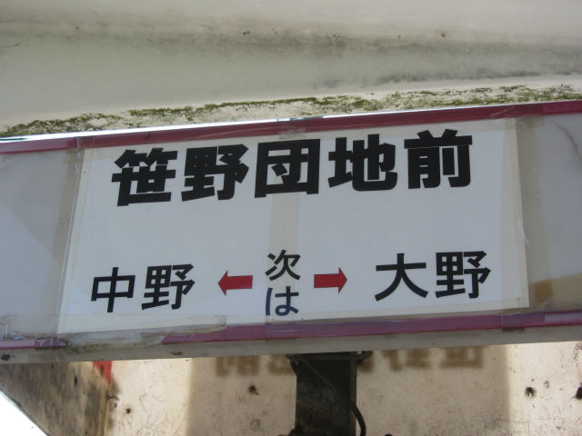さて、以前紹介した東大島団地前から4月に改称された、「笹野団地前」です。そして、行先がなぜか「奇人橋」に。