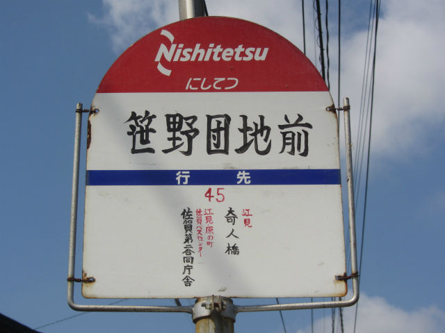 以前は行灯式だった停名標が、鉄板式に変わり、佐賀地区ではお馴染みの手書き文字になっています。この文字は鳥栖支社管内でしかみなかったので、てっきり鳥栖営業所の人がやっているものだろうと思ったのですが、こちらは佐賀本社管内なので、必ずしもそういうわけではないようです。